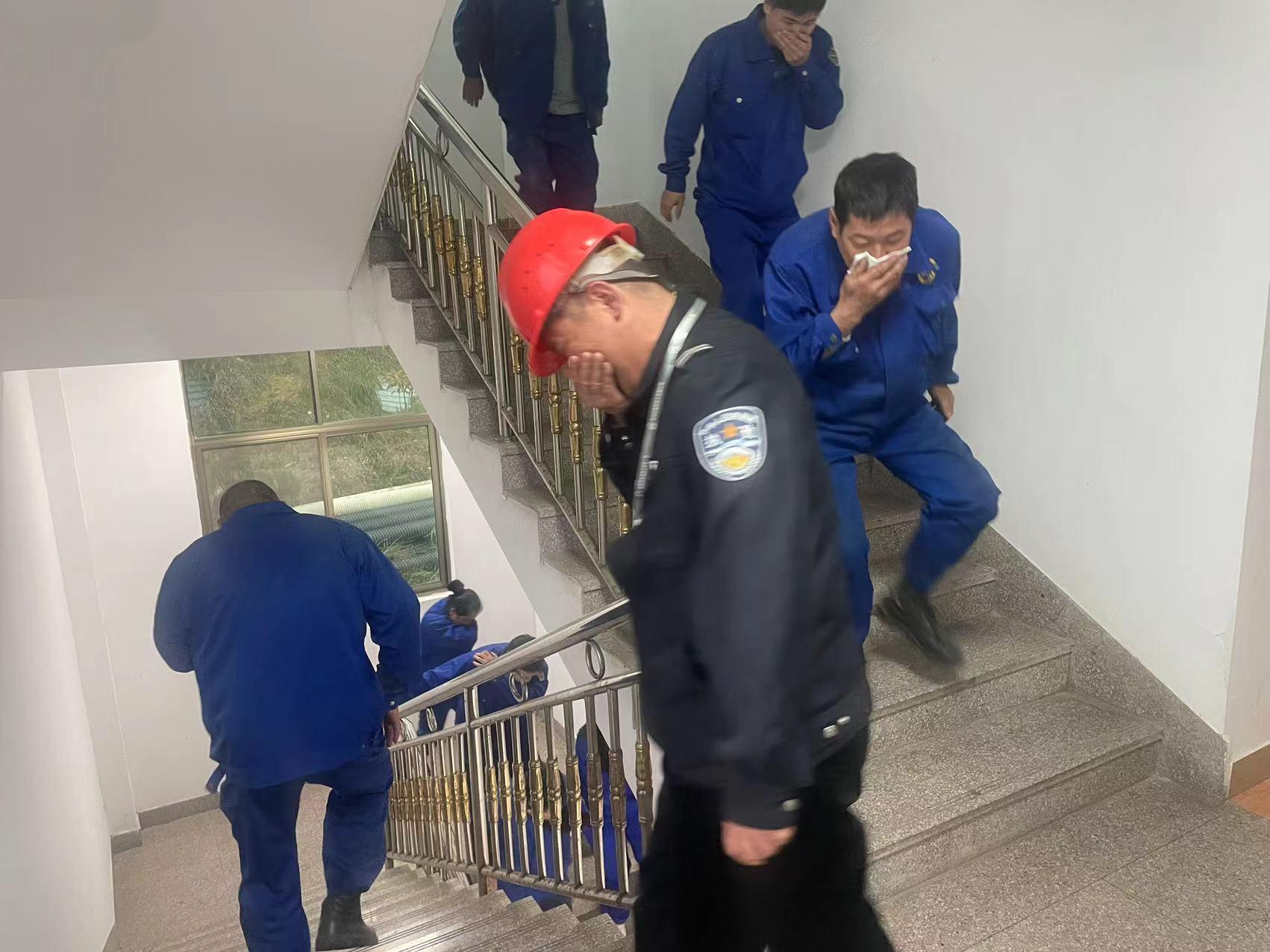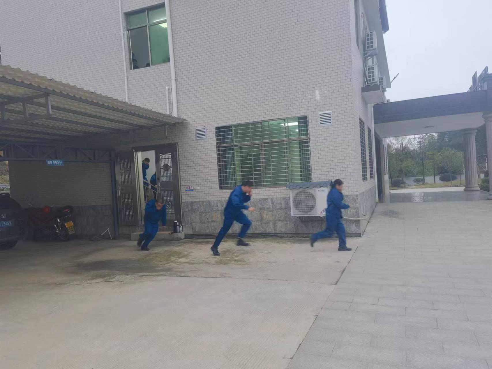 演練正式開始,模擬員工宿舍濃煙升起,火警報警聲響起,全體員工按照《消防應急疏散預案》的要求,彎著腰,捂著口鼻,按指定安全消防通道,有序撤離至安全地點。